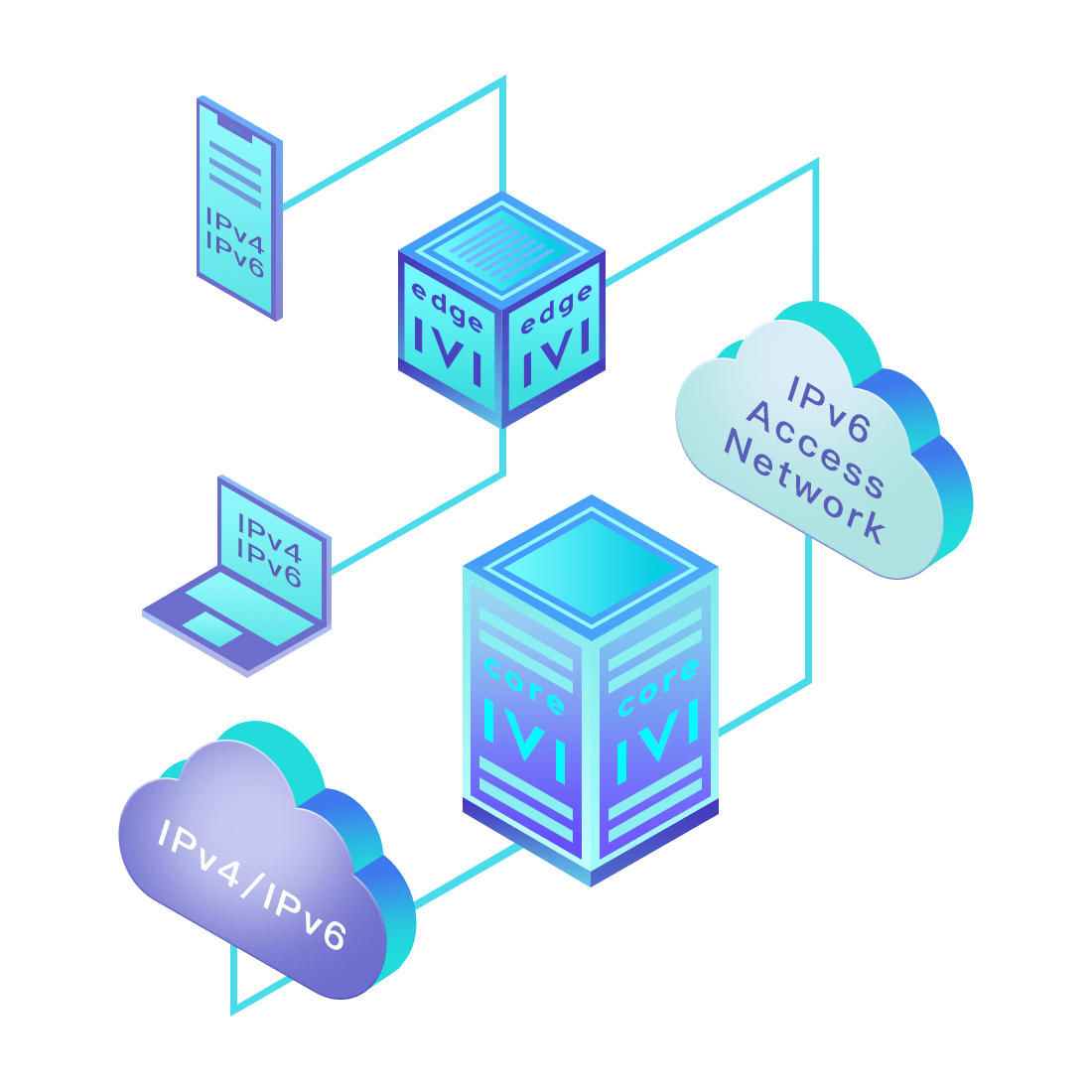 對正在進(jìn)行IPv6整體升級(jí)規(guī)劃的運(yùn)營商,應(yīng)用IPv6升級(jí)方案2.5,通過IVI無狀態(tài)翻譯技術(shù)和純IPv6接入網(wǎng)絡(luò),為雙??蛻舳撕碗p棧服務(wù)器提供連通服務(wù)。